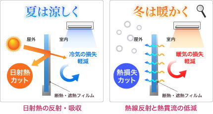 断熱遮熱フィルムは、太陽の日射しが強い時期に日射熱を反射して遮熱効果を発揮します。また、寒い時期は暖房の赤外線を室内側に反射したり、フィルム自体に熱を伝わりにくくする加工を施す事で、断熱効果を得ています。(製品によって異なります)