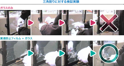 フィルムが貼付されているガラスは、ヒビが入るものの、ガラスが脱落しないため、手を差し込んで開錠する事が困難です。また、ハンマーやバットなどで殴打しても、ガラスを簡単に破壊する事は難しい為、侵入者を焦心させ、犯行を諦めさせる事が期待できます。