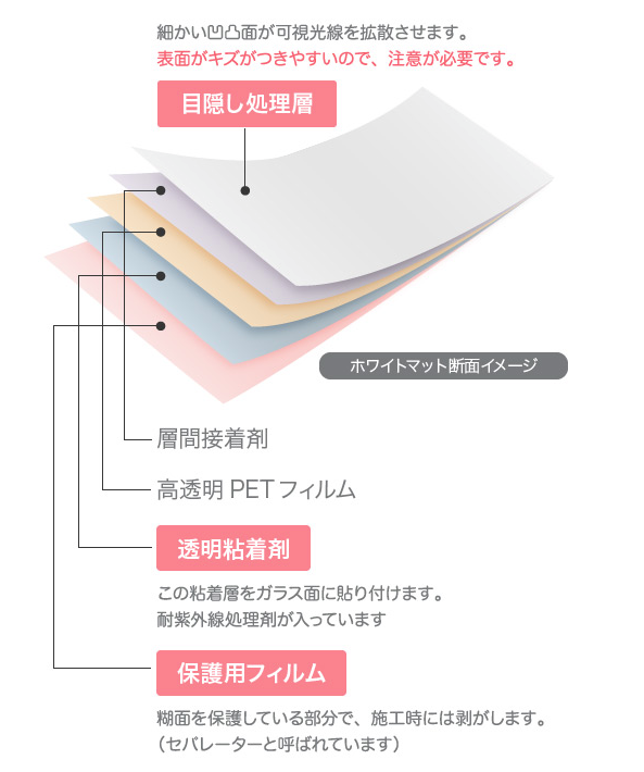 目隠しの仕組みとしては、人間が明るさを認識する光(可視光線)を拡散させることで物体を認識しづらくなります。また、室内に入る可視光線の量が必要以上に減らないため、暗くならないことが特徴です。