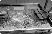 フィルムが貼付されているガラスは、ヒビが入るものの、ガラスが脱落しないため、手を差し込んで開錠する事が困難です。また、ハンマーやバットなどで殴打しても、ガラスを簡単に破壊する事は難しい為、侵入者を焦心させ、犯行を諦めさせる事が期待できます。